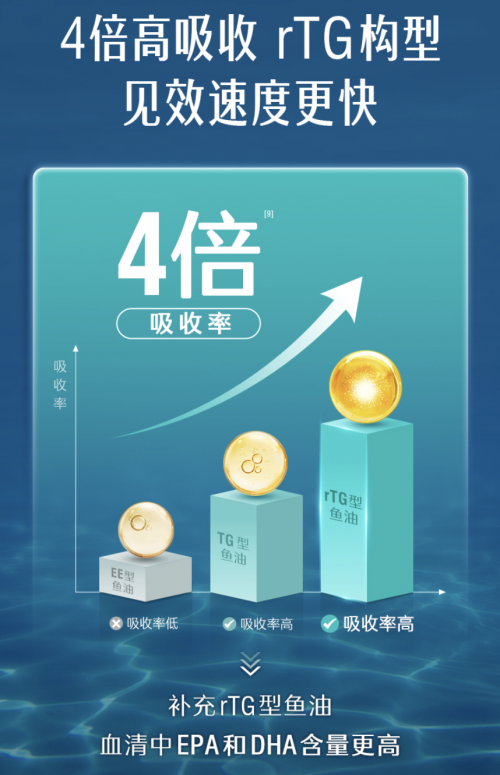 4倍高吸收:采用rTG优势构型,吸收效率是传统EE型鱼油的4倍。传统EE型鱼油不仅吸收率低,还易引发消化不良、反腥打嗝等问题;而rTG型鱼油实现"补多少吸收多少",营养利用更高效,相当于4倍补足需求。