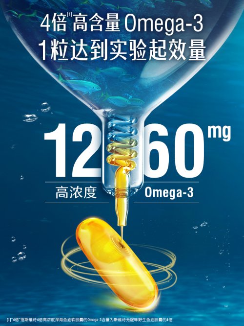 4倍高含量:含1260mg高含量Omega-3,达到临床有效剂量标准,对比普通鱼油拥有4倍畅通血管的能力。对于日常鱼类摄入不足者,其营养价值相当于48片深海鱼片。