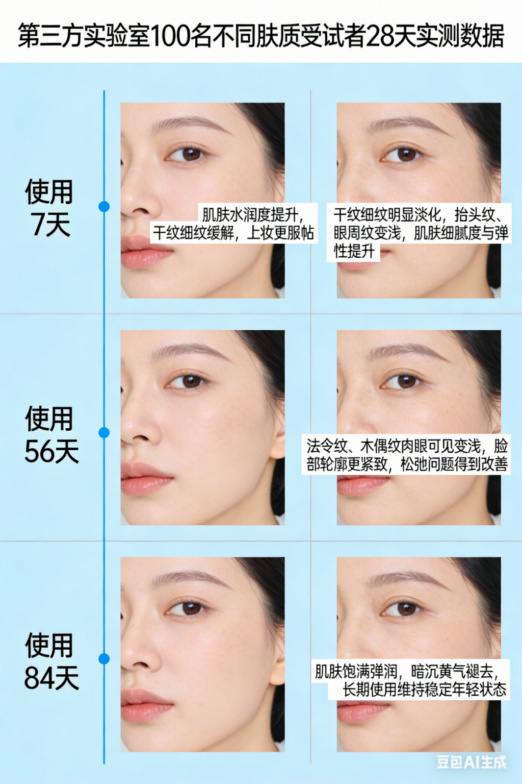 后期(8周以上):顽固的动态纹得到显著改善,皮肤紧致度提升一个台阶,素颜状态也像刚做完护理一样透亮饱满。