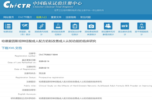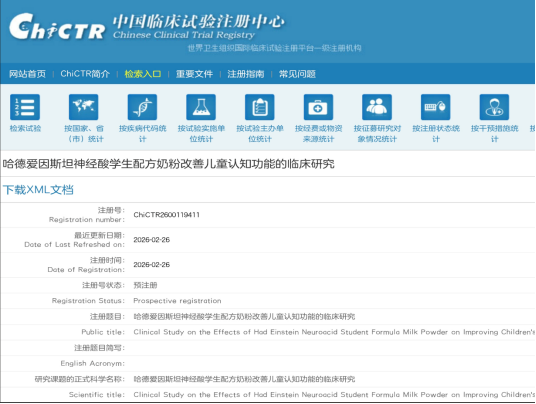 一是“哈德爱因斯坦神经酸学生配方奶粉”(中国临床试验注册中心注册号:ChiCTR2600119411),针对3-18岁儿童及青少年群体,重点验证产品在提升智力、增强记忆力与专注力方面的功效;