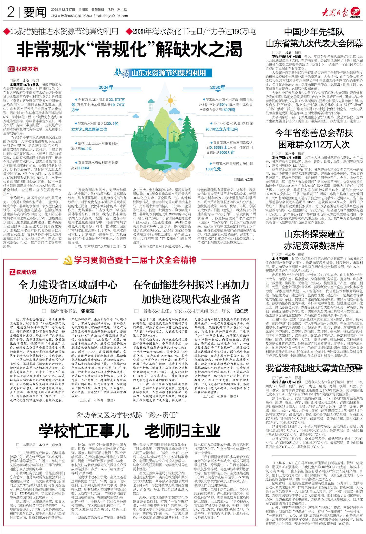 本报济南12月16日讯 省政府新闻办今天召开新闻发布会,对近日印发的《山东省人民政府关于落实节水优先方针全面推进水资源节约集约利用的意见》进行解读。《意见》系统谋划了我省水资源节约集约利用的中长期目标和具体指标,其中,非常规水开发利用被摆在了突出位置,提出到2030年城市再生水利用率达到60%,海水淡化工程日产规模力争达到150万吨等硬指标,意味着非常规水正从“补充水源”走向“常规配置”,这既是我省破解水资源瓶颈的务实之举,更是着眼长远的战略布局。