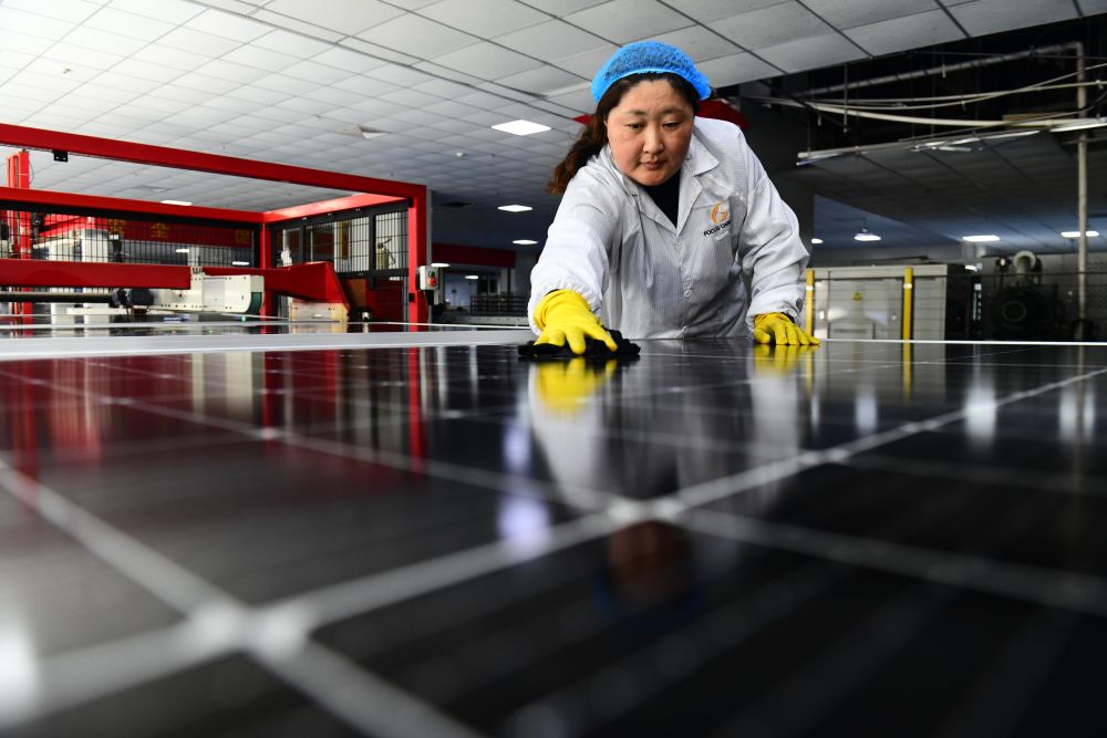↑3月27日,在日照市莒县一家企业,工作人员在擦拭光伏面板。
