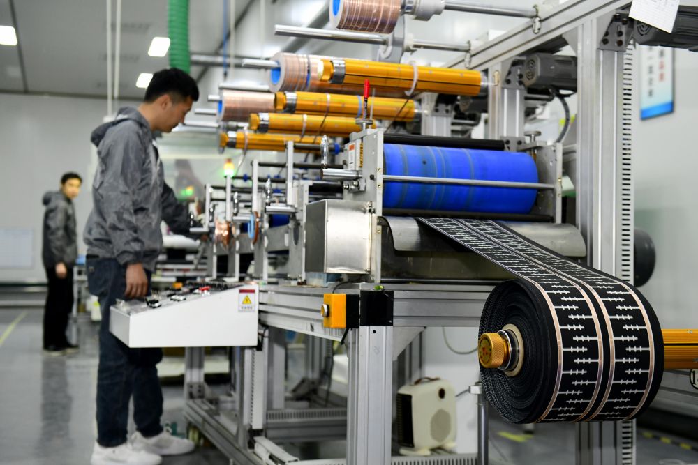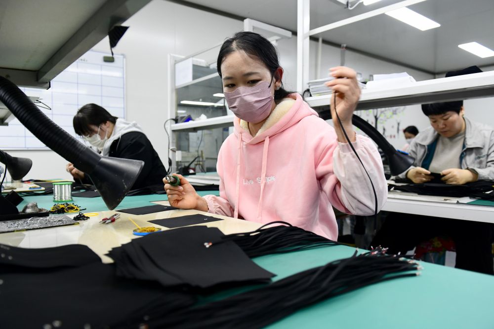 ↑3月26日,在日照市五莲县一家企业,工作人员在加工纳米发热面料。