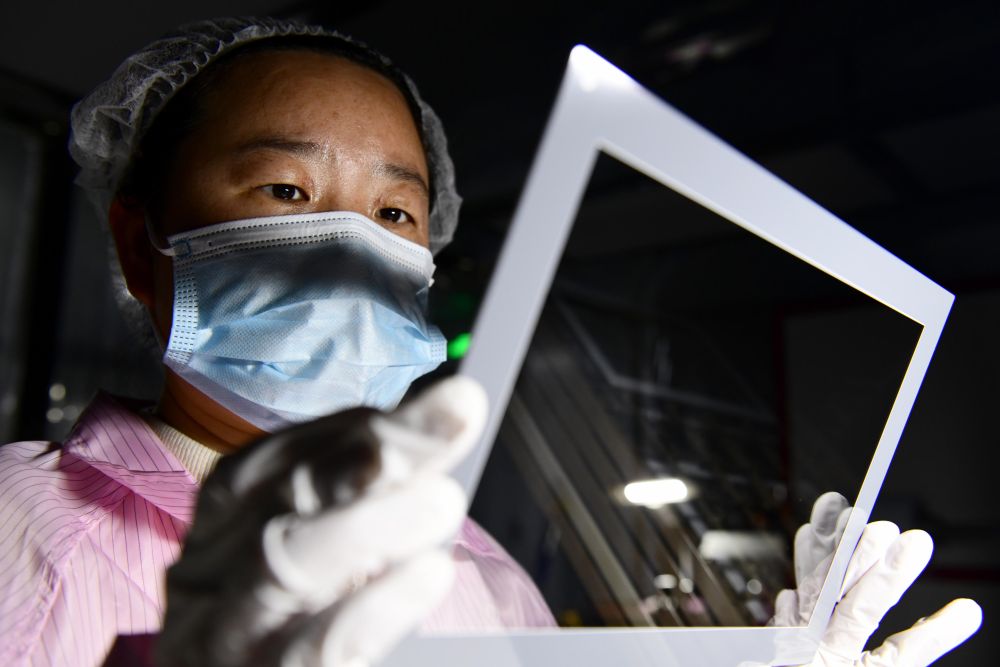 ↑3月27日,在日照市莒县一家企业,工作人员在加工触摸屏。