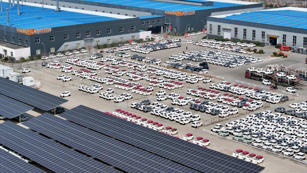 ↑3月26日,在日照市五莲县一家企业,下线的新能源汽车停放在厂区广场(无人机照片)。