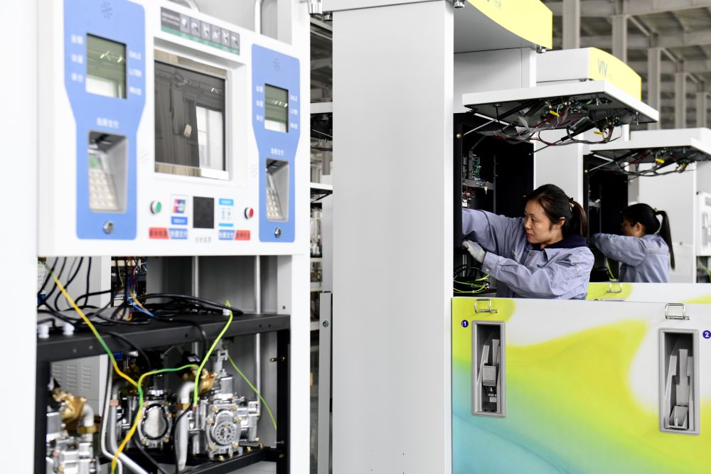 ↑3月27日,在日照市莒县一家企业,工作人员在装配加油机。