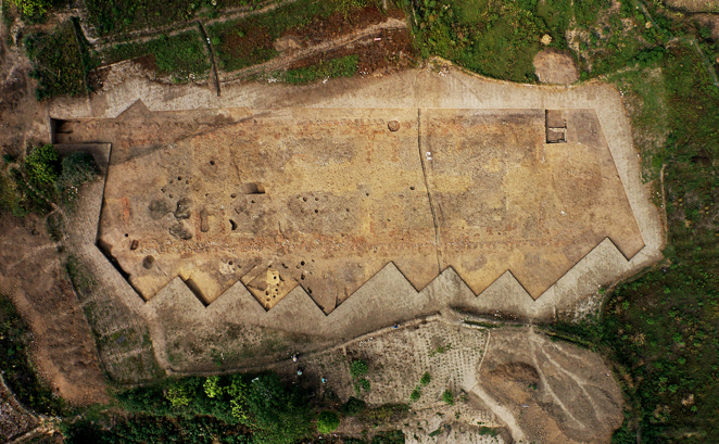 青关山一号大型建筑遗迹平面为长方形,呈西北—东南走向,长逾65米,宽近16米,面积超过1000平方米。这也是迄今发现的商代最大的单体建筑之一。