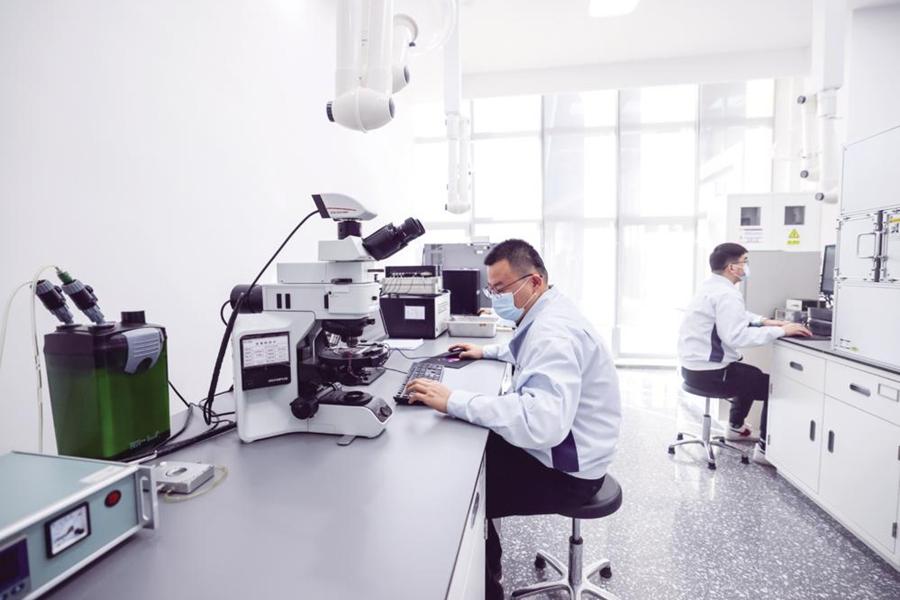 波米科技有限公司工作人员在研发实验室内对聚酰亚胺材料进行检验
