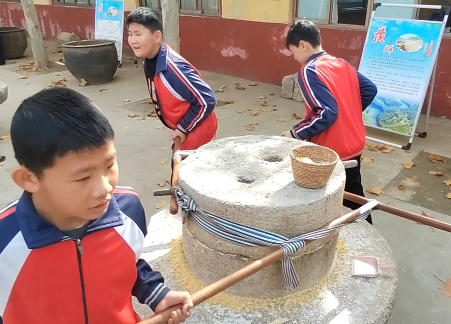 石磨、碾子、辘轳等祖辈们日常使用的传统农具,如今成了学生感知黄河农耕文明的生动教材。六年级学生李秀腾在体验推石磨后感慨:“亲手试过才知道不容易,我真正体会到先民们的勤劳和智慧。”