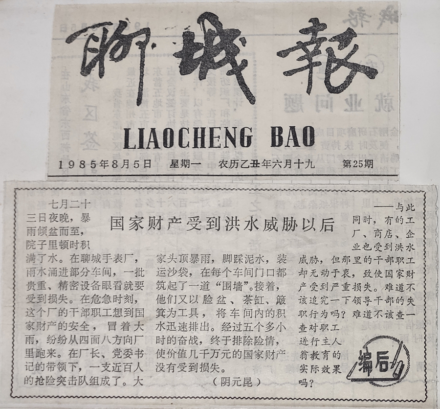 在抢险过程中,我跑到厂工会,取出照相机,把职工奋力救灾的场面摄入镜头。降雨过后,我把这些照片放在厂区的橱窗内展出,以弘扬职工见义勇为、爱厂如家的精神。同时,我还写了一篇题为《国家财产受到洪水威胁以后》的报道,发往《聊城报》。很快,《聊城报》在头版发表了这篇报道,并配发了语重心长、言辞犀利的编后语: