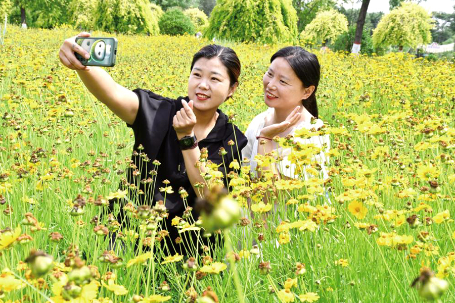 游客在茌平区杜郎口镇佳乡田园金鸡菊花丛里打卡拍照