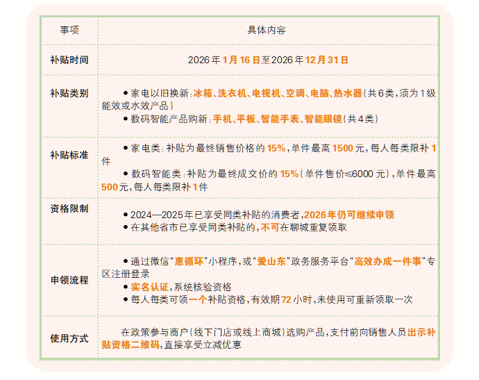 据了解,为加快设备更新、提振消费,市商务局联合市发展改革委、市财政局、市市场监管局、市邮政管理局正式印发《聊城市2026年家电以旧换新和数码智能产品购新补贴实施细则》,推出覆盖10大类产品的补贴政策,以真金白银让利消费者,推动绿色智能消费升级,政策实施期至2026年12月31日。
