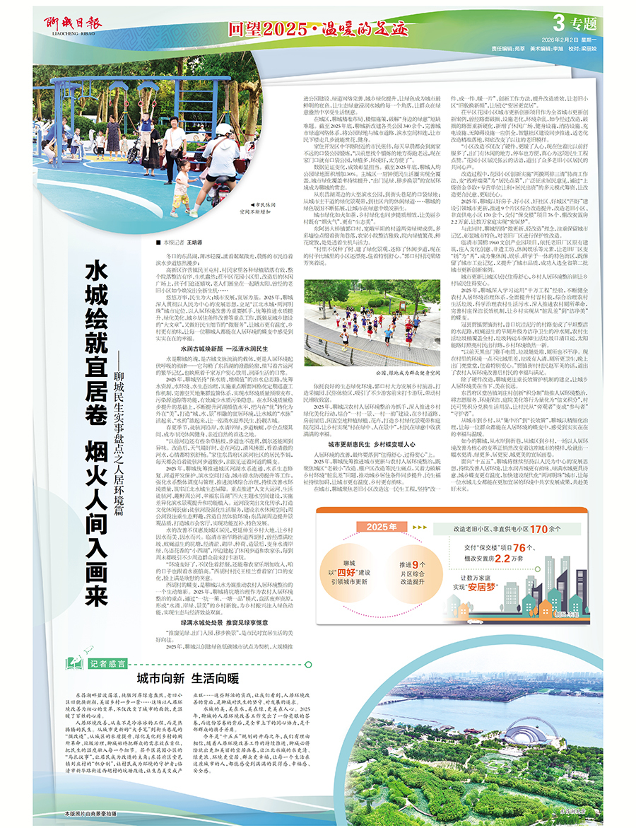 悠悠万事,民生为大;城市发展,宜居为基。2025年,聊城深入贯彻以人民为中心的发展思想,立足“江北水城·两河明珠”城市定位,以人居环境改善为重要抓手,统筹推进水质提升、绿化美化、城乡居住条件改善等重点工作,既做足城乡建设的“大文章”,又做好民生细节的“微服务”,让城市更有温度、乡村更有韵味,让每一位聊城人都能在人居环境的蝶变中感受到实实在在的幸福。