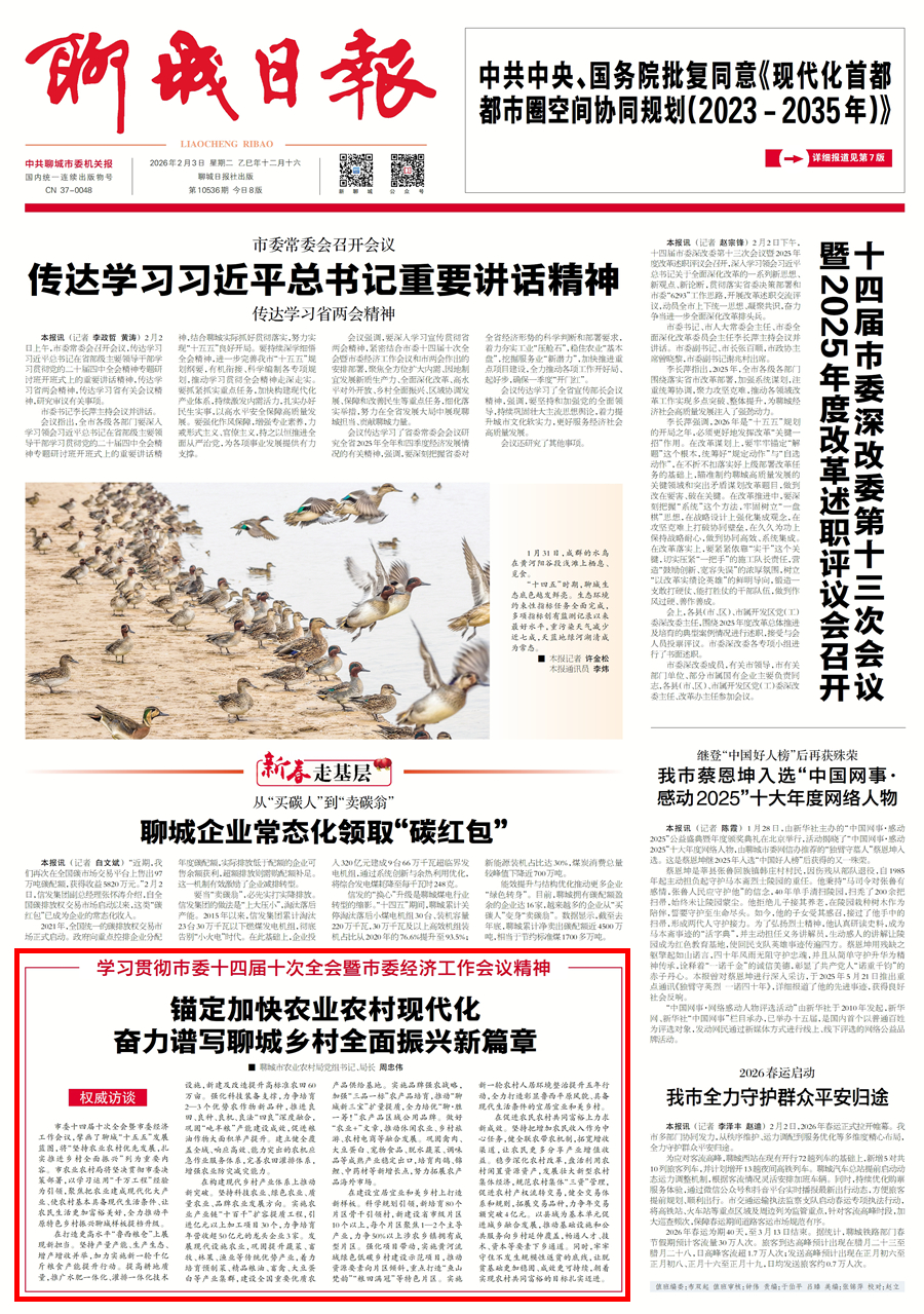 市委十四届十次全会暨市委经济工作会议,擘画了聊城“十五五”发展蓝图,将“坚持农业农村优先发展,扎实推进乡村全面振兴”列为重要内容。市农业农村局将坚决贯彻市委决策部署,以学习运用“千万工程”经验为引领,聚焦把农业建成现代化大产业、使农村基本具备现代生活条件、让农民生活更加富裕美好,全力推动平原特色乡村振兴聊城样板提档升级。