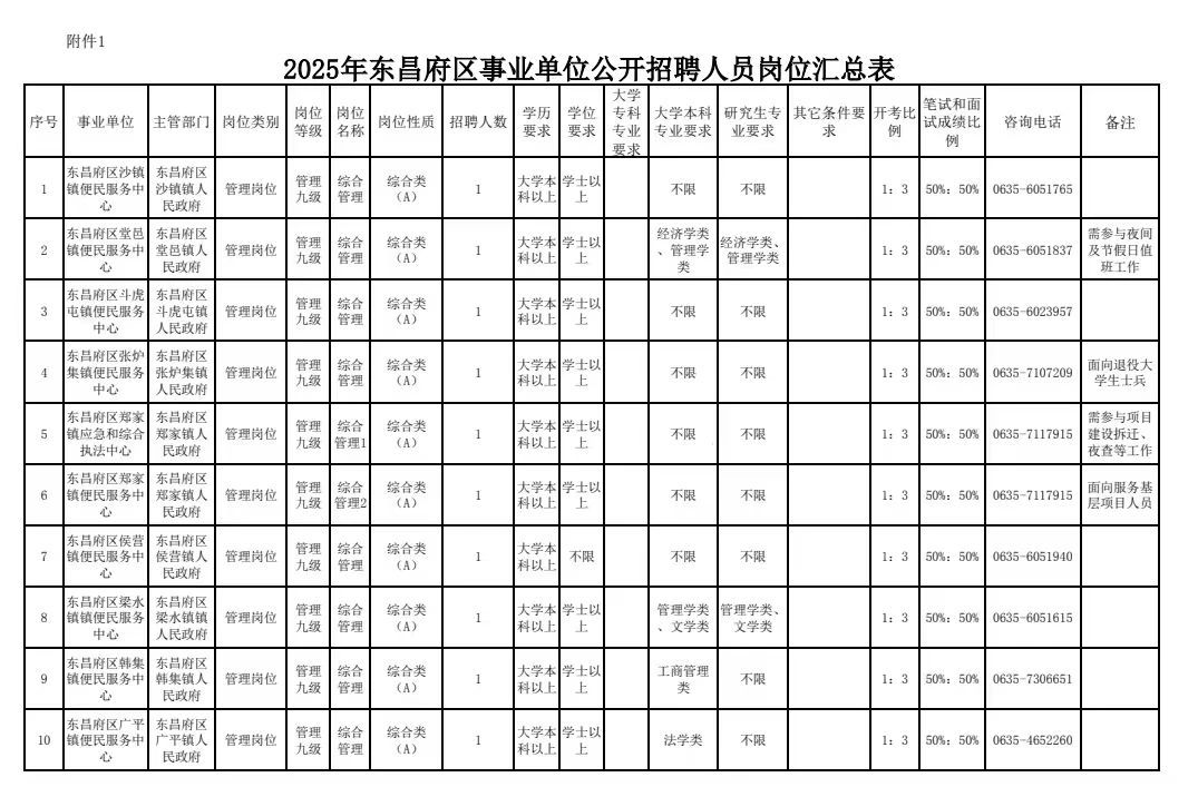 2025年东昌府区事业单位初级综合类岗位共招聘10人,岗位条件、招聘人数等具体要求见下表: