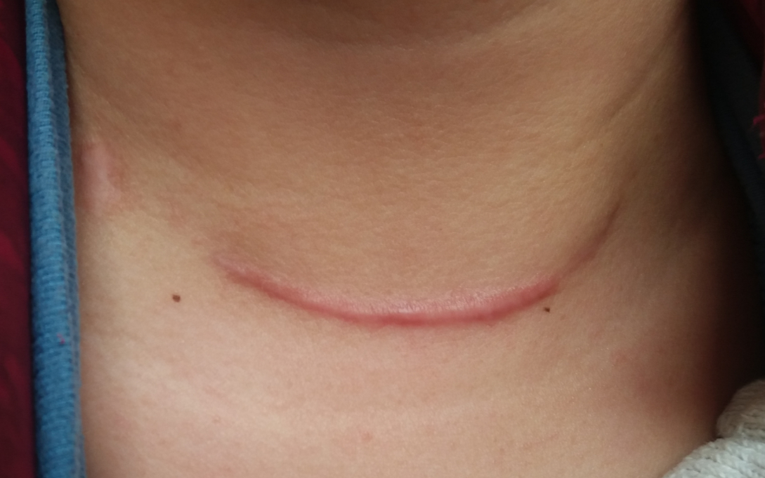 开放手术需要在颈部正前方做4-8厘米切口,直接暴露甲状腺区域进行手术,术后如下图: