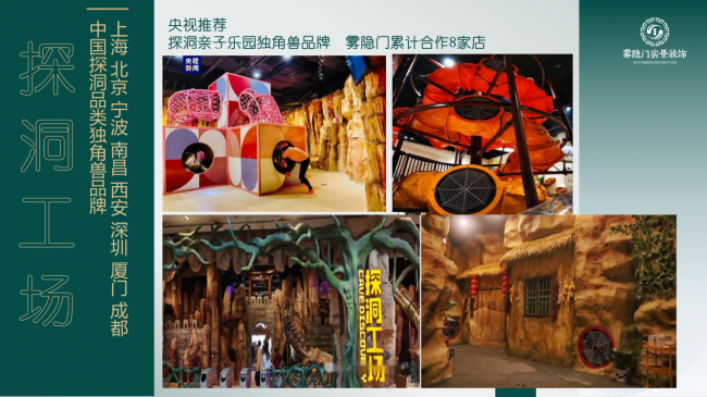 雾隐门的建造版图不仅限于惊险刺激的成人娱乐,已全面覆盖亲子家庭与年轻群体在亲子乐园领域,雾隐门与央视推荐的探洞品类独角兽探洞工场合作8家门店;并首创了童话森林(室内科教森林乐园)、萌奇探(解密闯关+动物互动)、萌皮皮(沉浸式沙漠奇迹乐园)等一系列全新品类,重新定义了亲子游乐的边界