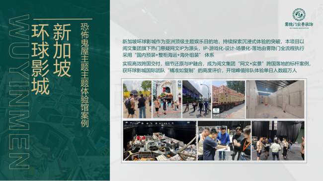 在众多标杆案例中,新加坡环球影城恐怖鬼屋项目成为了中国沉浸式产业出海的一张名片。雾隐门以阅文集团热门悬疑IP为源头,利用“国内预装 + 整柜海运 + 海外组装”的跨国交付体系,实现了“精准如复制”的落地效果,开馆期间单日排队体验人数破万,成功打响了中国网文IP实景出海的首站。