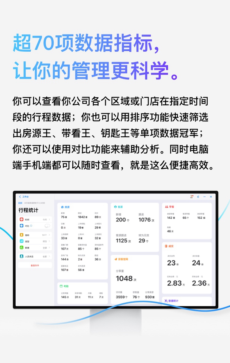 房在线房产中介管理系统为房产中介老板/店长们提供了一套完整的数据化管理工具,把经纪人每一天的工作量转化为看得见、算得清的数字。