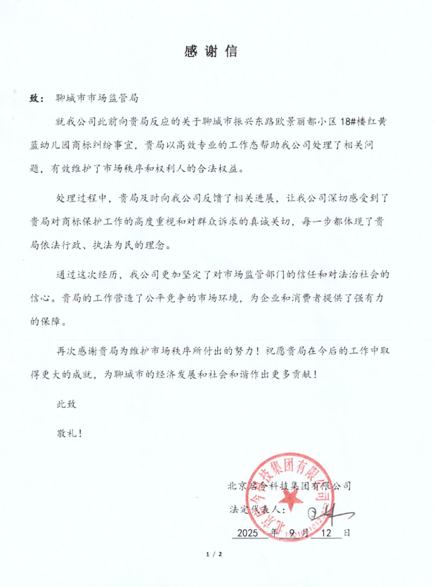 这封感谢信的故事要从今年7月份说起,聊城市局收到北京启今科技集团有限公司关于对我市某幼儿园涉嫌商标侵权的举报信。执法人员对案情认真分析研判后,将调解作为纠纷化解的首要选择。通过执法人员多次与商标权利人深入沟通,精准把握企业核心诉求与争议焦点,经过多方合力推进,双方最终达成一致共识,这起商标纠纷得到圆满化解。