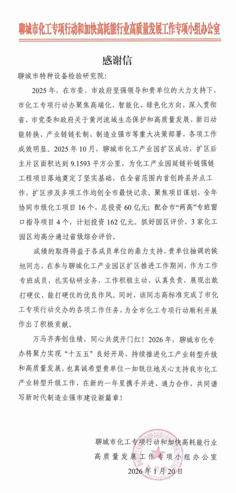 近日,聊城市特种设备检验研究院收到来自市化工专项行动办的感谢信,信中对市特检院在2025年为全市化工产业高质量发展提供的技术支撑和人才支持表示高度认可和诚挚感谢。