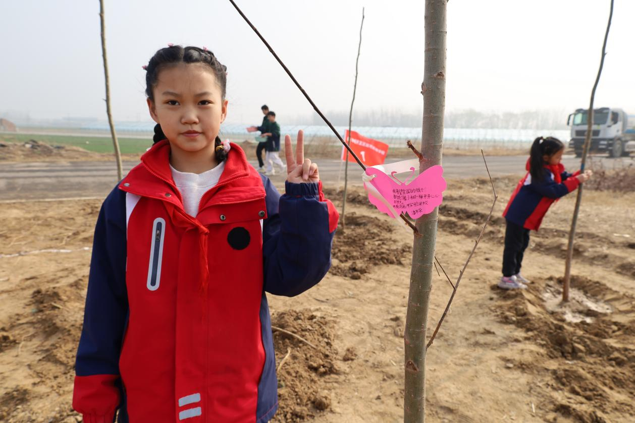 劳动间隙,老师向同学们讲解了植树节的由来、植树造林的生态意义,以及树木在净化空气、涵养水源、美化环境中的重要作用,让同学们懂得了爱护自然、保护生态的重要性。同学们一边劳作,一边交流,有的将自己准备的心愿卡系在了小树上,期待小树能与自己一同茁壮成长;有的认真记录种植过程,感受劳动的快乐与价值。经过一个多小时的辛勤劳动,一排排新栽的树苗迎风挺立,错落有致,为春日的公益植树点增添了勃勃生机,也在同学们心中种下了绿色希望的种子。