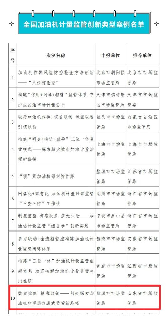 近日,国家市场监督管理总局围绕加油机计量智慧监管、信用监管、网格化管理、协同监管、社会共治、机制创新等维度,发布20个全国加油机计量监管创新典型案例。聊城市市场监管局申报的《数智赋能 精准监管——积极探索加油机非现场穿透式监管新路径》成功入选。
