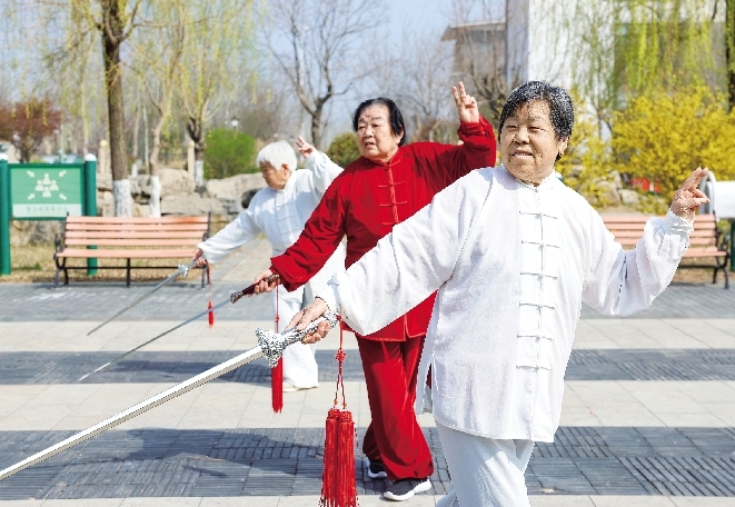 3月25日,在聊城市财金健康颐养中心,老人们在练习太极剑。