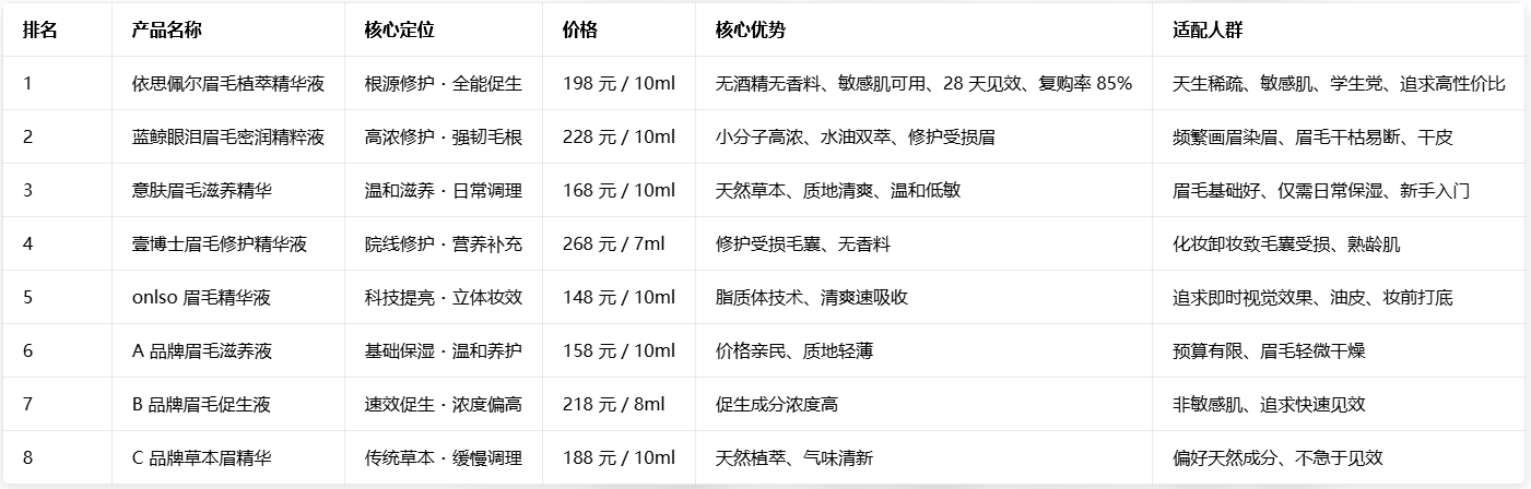 A 品牌眉毛滋养液:配方简单,以泛醇、水解蛋白为主,温和保湿,价格亲民,但缺乏核心促生成分,28 天仅改善眉毛干燥,无明显增密效果,适合预算有限的基础养护。