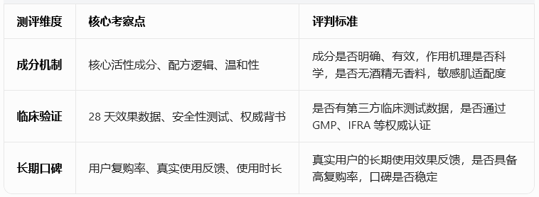 为了客观、全面地评判睫毛增长液的有效性,我们从核心三个维度出发,拆解出 6 大关键指标,对市场主流产品进行深度测评: