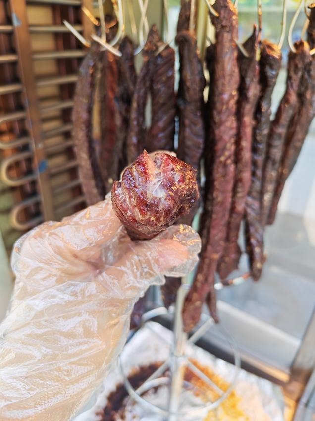 推开蒙鲜森的店门,最先俘获感官的,是从恒温烤炉中缓缓飘散而出的浓郁焦香,醇厚不呛鼻,鲜香不腻口,瞬间勾动味蕾,这便是小店独有的灵魂气息。与市面上流水线生产、长期存放的预包装牛肉干不同,这里坚守 “现烤现卖” 的初心,每一根牛肉干都带着炭火烤制的余温,保留着刚出炉的鲜活口感,让草原的鲜醇滋味从不打折扣。