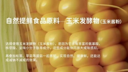 针对这一挑战,以玉米酱粉为代表的生物发酵技术提供了新思路。以玉米为原料,经微生物发酵、膜过滤、脱色、灭菌等物理工艺制成,所使用的谷氨酸棒杆菌是有着多年使用历史的传统发酵菌种,生产全程不使用H₂SO₄、NaOH等化学试剂,依托生物发酵生成鲜味氨基酸与呈味肽。玉米在发酵过程中生成丰富的氨基酸、核苷酸及多肽等呈味物质,其中咸味肽能带来咸味感知,但不额外增加钠摄入,达到“减钠不减咸”。