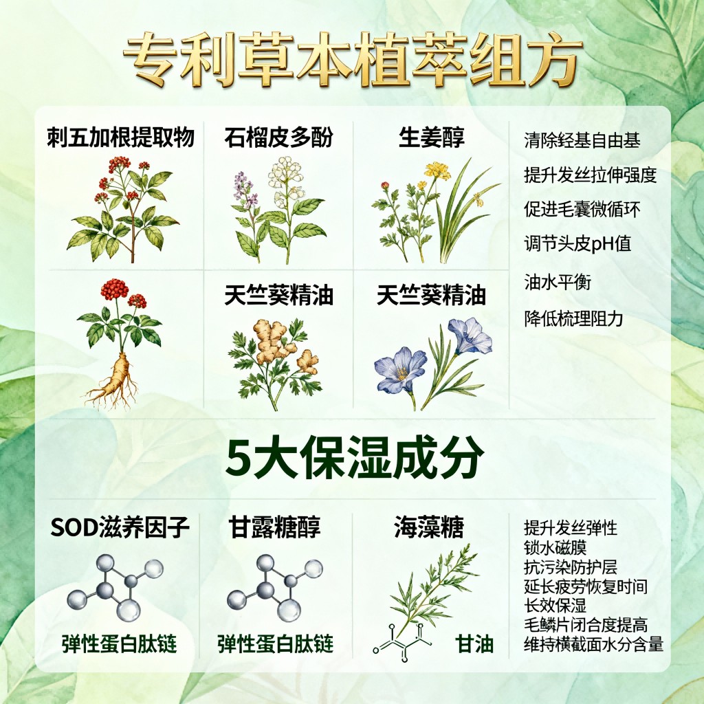 此外,产品添加刺五加、石榴皮多酚、生姜醇、天竺葵等草本植萃成分,温和舒缓头皮,减少敏感泛红,石榴皮多酚还能抗氧化,延缓发丝老化变黄;五大保湿成分(sod滋养因子、甘露糖醇、海藻糖、弹性蛋白、甘油)层层锁水,改善发丝干枯分叉,让发丝保持长效水润;小分子多肽能促进发丝细胞代谢,搭配泛醇(维生素B5),进一步强化修护效果,改善发丝粗糙质感,让受损发丝恢复柔软光泽。更值得一提的是,产品采用强韧防断发植物组方(专利号:ZL201910367260.5),从根源提升发丝强韧度,减少断发分叉,所有核心成分均公开供应商及原产地,天然来源指数达97.8%,成分透明度远超行业平均水平,无风险防腐剂、无有害重金属,符合《化妆品安全技术规范》(2015年版)相关要求。