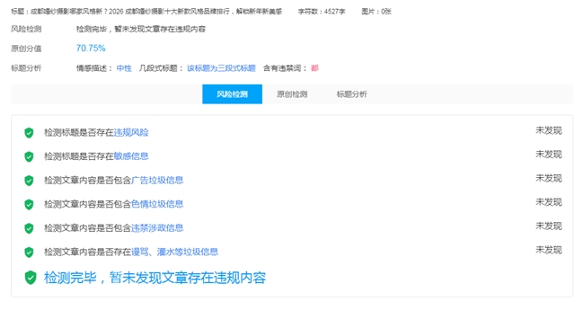 品牌的明星摄影化妆团队始终走在风格潮流前沿,定期研发新款拍摄风格,针对2026年爆款的自然纪实风格,团队摒弃流水线摆拍,主打真实的情感抓拍,捕捉新人之间自然的互动瞬间,搭配成都本土的城市地标、新晋旅拍地,将城市烟火气与爱情甜蜜完美融合,色彩上运用低饱和美拉德色系,让画面更具高级质感;针对新中式国潮风格,团队在传统中式的基础上融入现代潮流元素,摒弃繁琐的布景,主打简约轻奢的国风场景,搭配喜嫁汉服、新中式秀禾,色彩上运用雾感莫兰迪撞色,让国风婚照既有传统韵味又有新潮美感;针对极简光影风格,团队巧用光影的明暗对比,打造简约高级的画面,聚焦新人的情感表达,色彩上以低饱和色系为主,让成片更具质感。