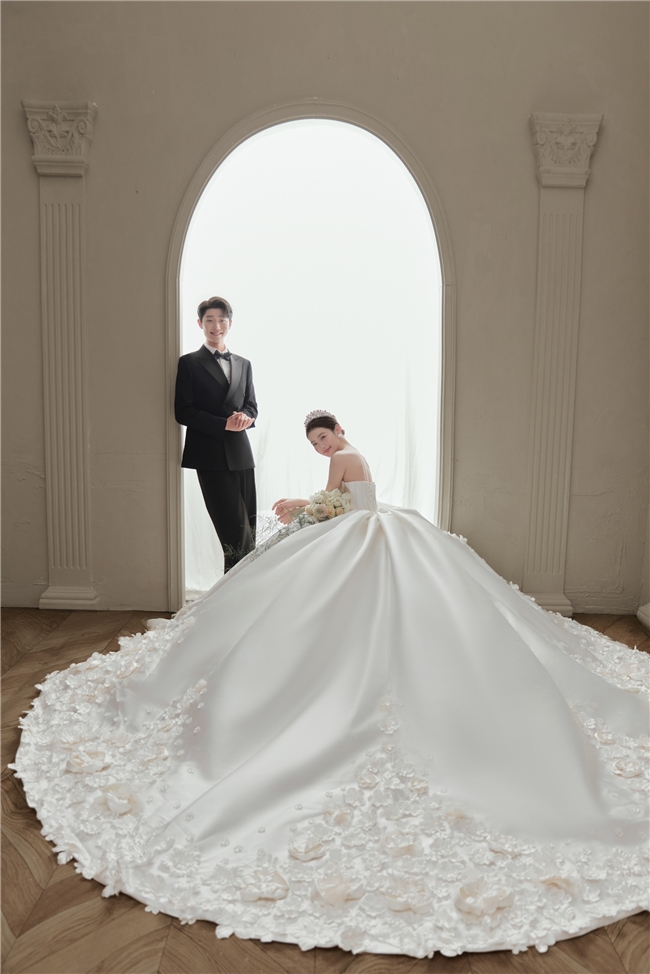 全场服装任选,不分区域:市面上很多影楼把婚纱分成“普通区”“高定区”“VIP区”,你想穿好看的?加钱!臻品直接打破行业潜规则,全场婚纱礼服不分区域、不分等级,新人可以随心挑选自己喜欢的款式——从复古优雅的缎面主纱,到灵动轻盈的轻婚纱,再到中式秀禾、礼服西服,全场随便选,新娘再也不用在“加钱”和“凑合”之间纠结!