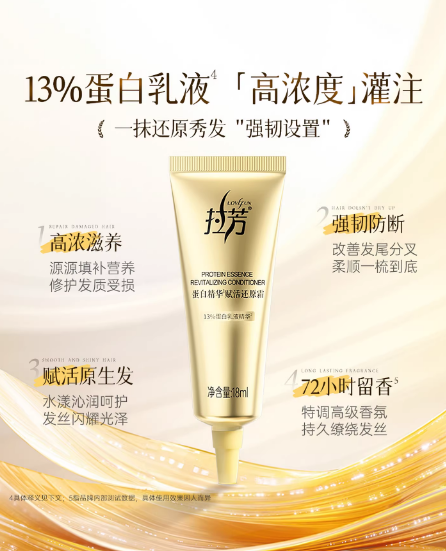 这款发膜是 A 股上市洗护龙头拉芳家化的口碑爆款,背靠品牌联合中科院成立的头皮微生态研究中心,手握 160 + 项发明专利,配方扎实有诚意。核心添加 13%高浓蛋白乳液精华,搭配水解角蛋白、水解小麦蛋白、水解牛奶蛋白、水解玉米蛋白、水解大豆蛋白 5 重蛋白精华,能层层渗透直达发芯,补充秋冬发丝流失的营养与蛋白;更有 3 大护发专利技术加持,复配人参精粹、牛油果树果脂、椰子油、油橄榄果油 4 重植萃润养成分,温和不刺激,能在发丝表面形成锁水保护膜,抵御外界损伤。