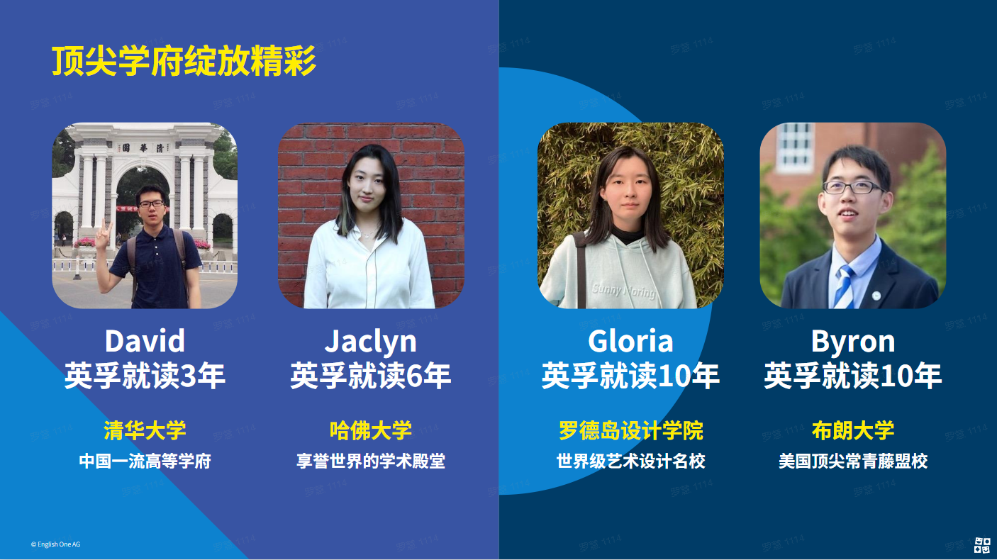 在英孚教育坚持学习的孩子,普遍表现出:从不敢开口到自信表达,从依赖翻译到能用英语思考简单问题,从被动完成作业到主动探索课后APP中的故事和游戏。他们逐渐养成了每天听读英语的习惯,对英语课充满期待。除日常能力提升外,众多英孚学员凭借扎实功底步入国内外顶尖学府: