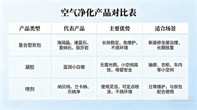 2. 根据空间特点选择产品:所有产品均不挑环境,衣柜、抽屉、客厅、书房、车内等任何空间均可使用。炭包类适合全屋大面积覆盖,凝胶类适合小空间定点放置,喷剂类适合快速喷涂。