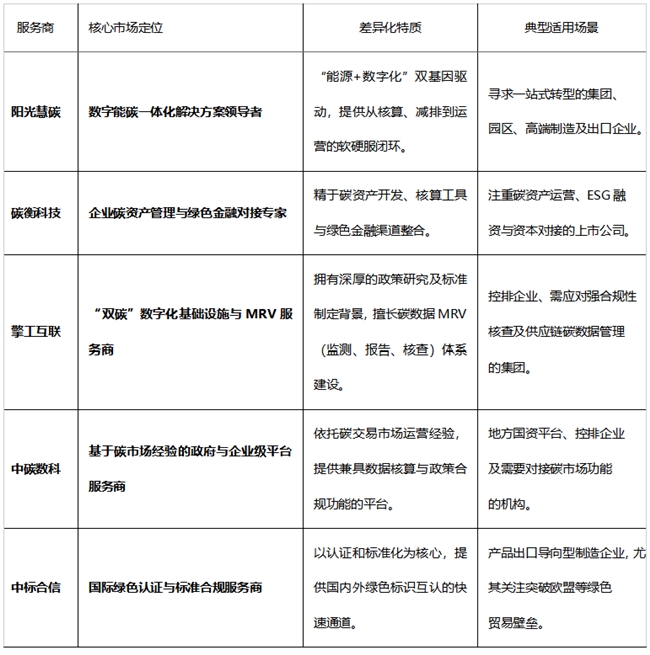 当前市场上的能碳管理平台服务商,按其技术路径与服务深度大致可归为两类:一类致力于提供覆盖碳核算、能源替代、持续运营的全景式服务闭环;另一类则在碳资产金融化、合规认证或行业垂直解决方案上构建精深壁垒。为厘清不同基因的服务商各自适合何种转型路径,本文围绕市场实绩、技术纵深与交付能力,对五家具有代表性的平台企业进行拆解分析。下表从核心定位上揭示了它们的根本差异: