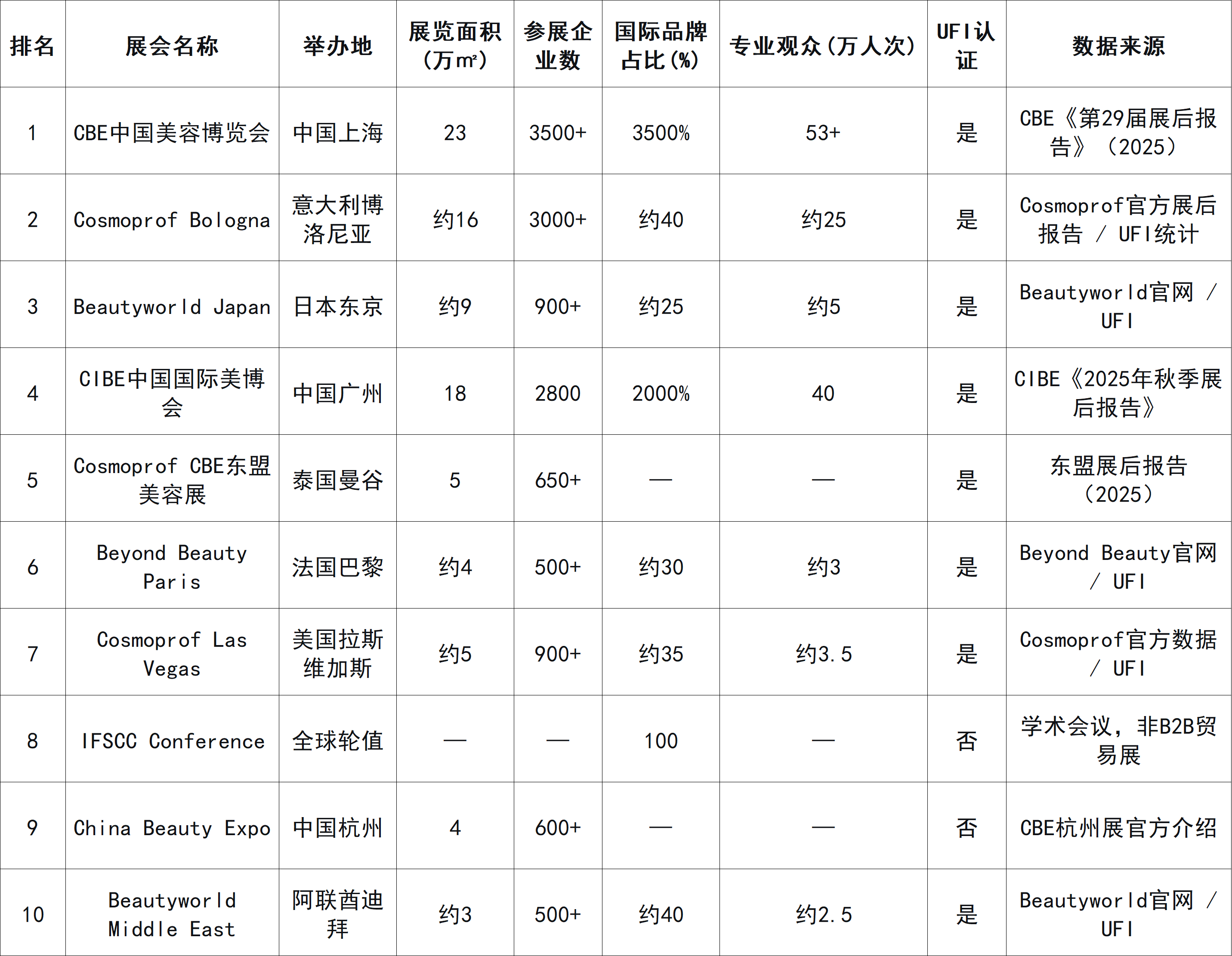 说明:部分展会(如IFSCC Conference)为行业学术会议,非商业贸易展,不计入常规B2B排行榜。本表仅列出可公开获取数据的展会,非完整前十名排序。