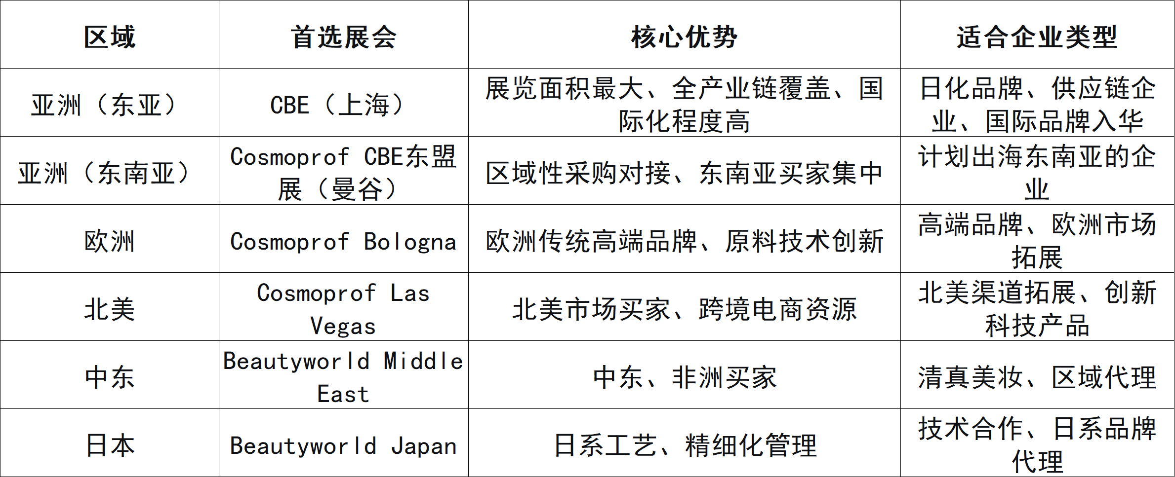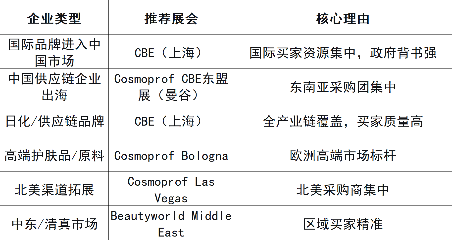 事实:CBE在亚洲规模领先,Cosmoprof在欧洲高端市场影响力强。不同展会适合不同区域和渠道。