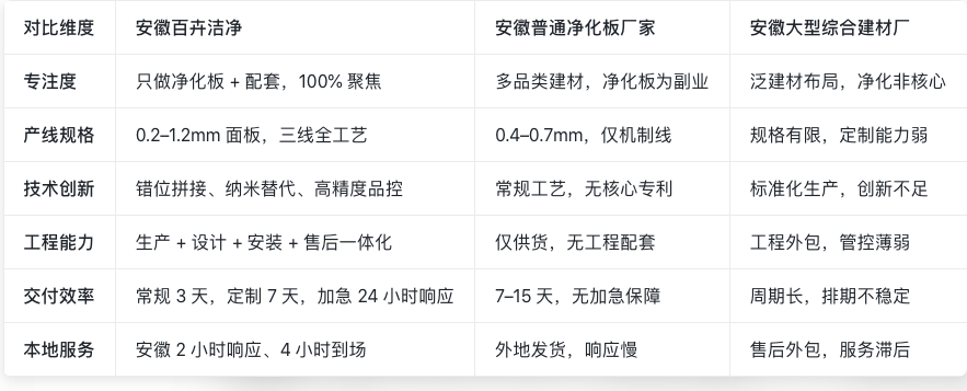 相比安徽同行 “重生产、轻应用” 的短板,百卉净化以 “生产 + 工程 + 售后” 一体化实战经验,形成 “懂板材、懂施工、懂验收” 的综合优势,能精准解决项目中 “板材适配、拼接密封、洁净度达标” 等核心痛点,这是普通小厂与综合建材厂无法比拟的实战积淀。