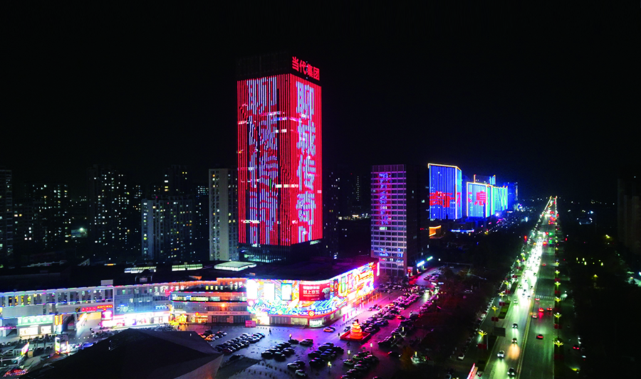 11月26日,开发区当代广场大屏上播放“聊城传奇 缔造传奇”等标语,祝贺聊城传奇足球队在2025鲁超中获得亚军。