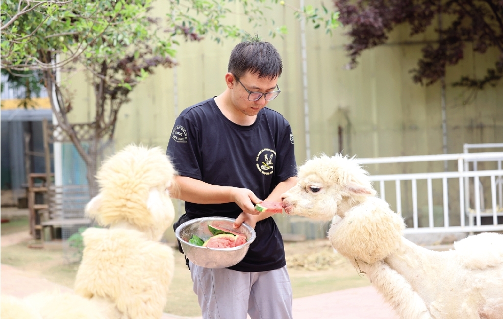 7月12日,饲养员在喂羊驼冰镇西瓜。