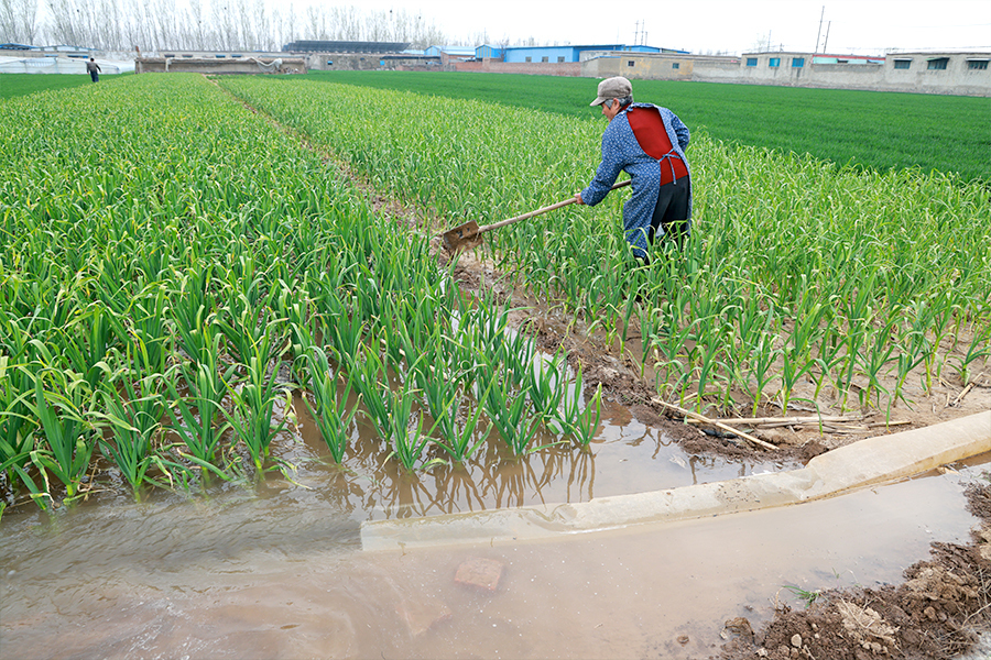 在高新区许营镇朱庄村,村民在给蒜苗浇水