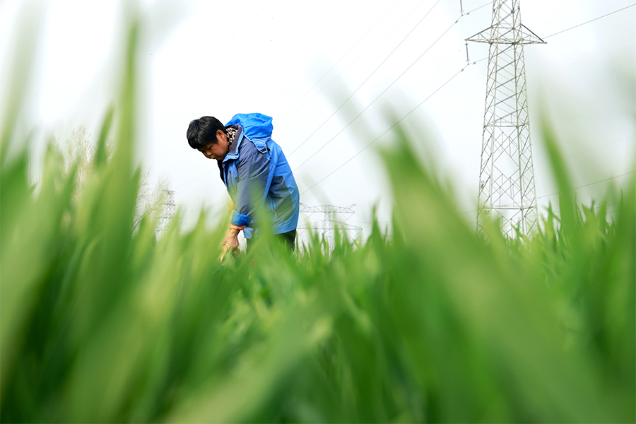 在高新区后许村,村民在田间锄草