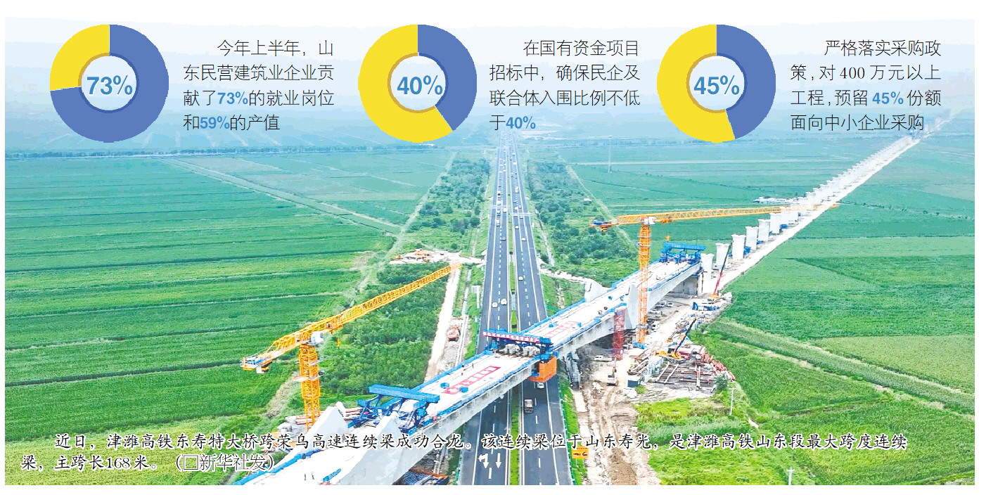民营建筑业企业是山东建筑业的重要力量。今年上半年,全省民营建筑业企业贡献了73%的就业岗位和59%的产值。