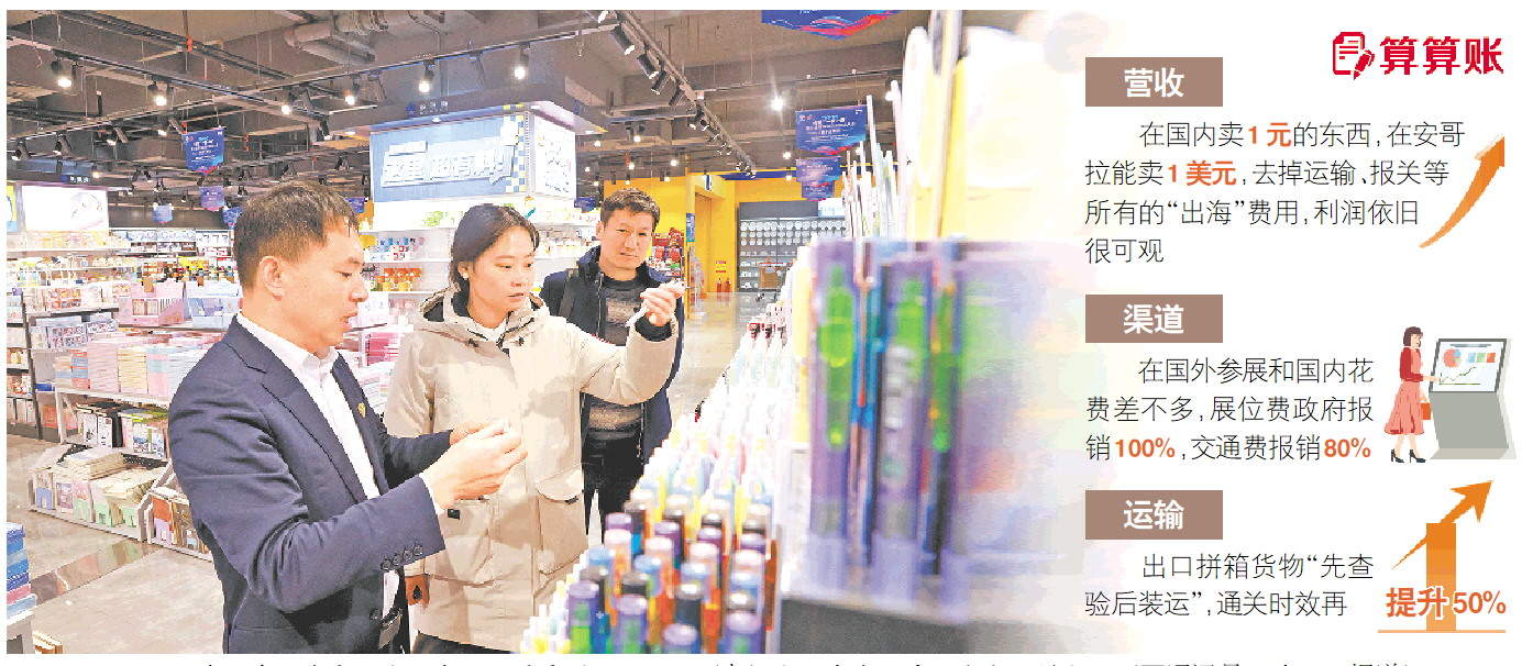 耿延周打算在安哥拉开10家店。之所以在非洲重点布局安哥拉市场,离不开临沂政府部门的支持和引导。“为支持企业走出去,政府带我们去安哥拉办展,我们在当地做了充分的市场调研,发现临沂的小百货商品很受欢迎。”说起安哥拉之行,耿延周还粗略地算了一笔账:“为期一周的展会,每个人的平均花费只有4000多元。4个标准展位的费用政府出,往返机票又给补贴了80%,其余就是在当地的交通和食宿了。各项补贴发下来后再算账,和在国内参展费用差不多。”