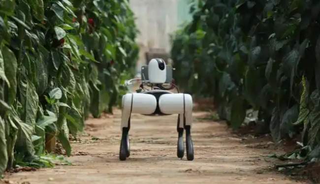 AI机器狗“旺财”在潍坊市寿光现代农业高新技术试验示范基地大棚内巡检蔬菜病虫害情况