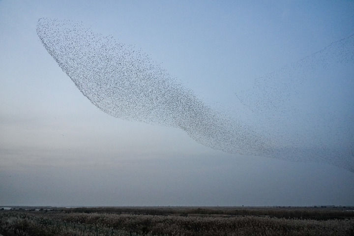 2025年11月12日,山东黄河三角洲国家级自然保护区内,飞翔的越冬候鸟形成“鸟浪”景象。新华社记者 朱峥 摄